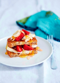 Top with half of the sliced strawberries and banana and sandwich with the remaining halves of the French toast. Finish with the ricotta, strawberries and banana. Drizzle with honey and scatter with the toasted flaked almonds and serve.