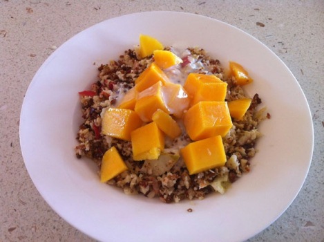 Place all ingredients into a bowl and mix. If you have a thermomix place all unprepared ingredients into the TM bowl, put the dial on, close lid and pulse a few times. I like mine chunky. Serve with yogurt and fresh mango.